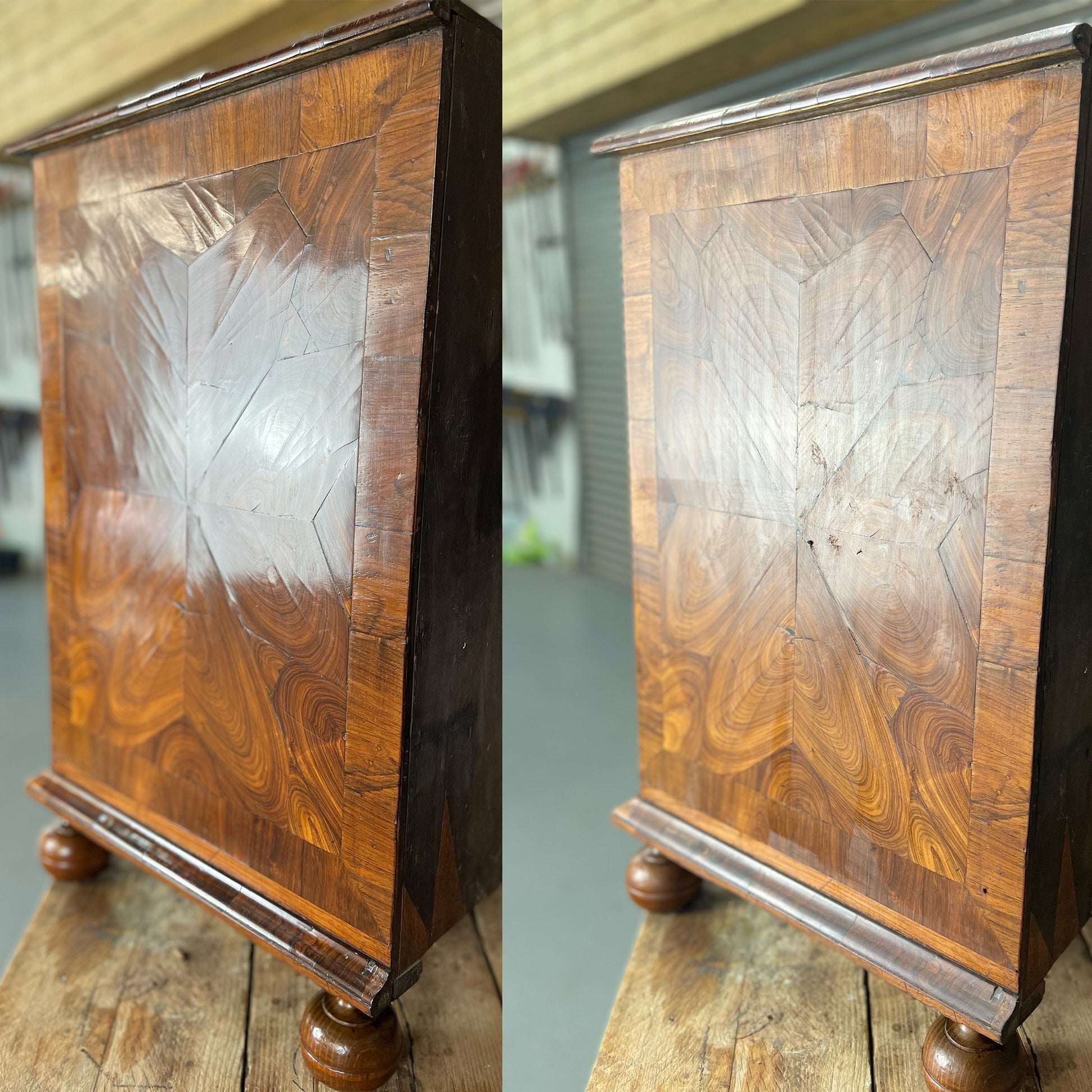 If you have a larger surface like the side of a chest of drawers or the top of a dining table apply the beeswax more evenly by dabbing the surface all over with small amounts of polish, then wipe in the direction of the grain to spread the wax evenly.